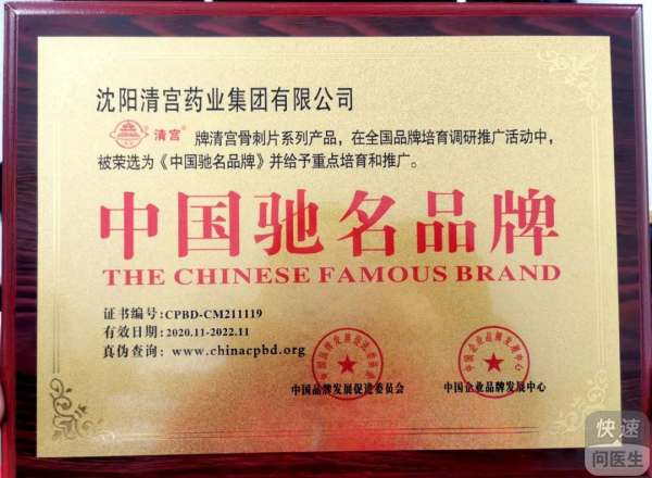 2020,清宫药业勇迎挑战,载誉而来!在近期的全国品牌培育调研推广活动中,经中国品牌发展促进委员会、中国企业品牌发展中心认证,以及相关技术监督部门的严格审核,清宫骨刺片成功当选“中国驰名品牌”!